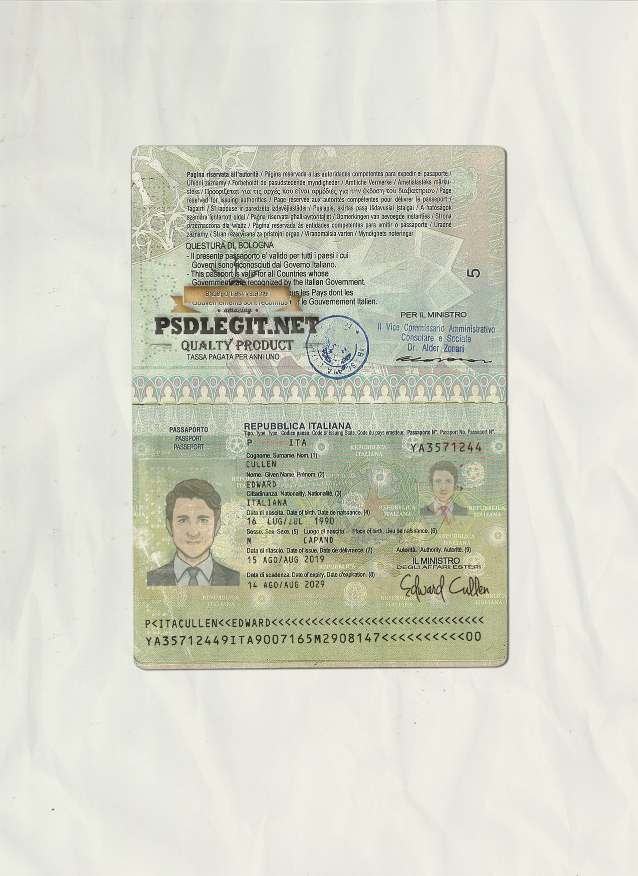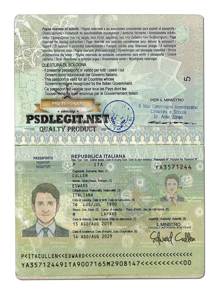 Italy Passport PSD Template. you can edit this template and put any name, address, license number, Id number, birth date, height, weight, expire date, change photos etc.